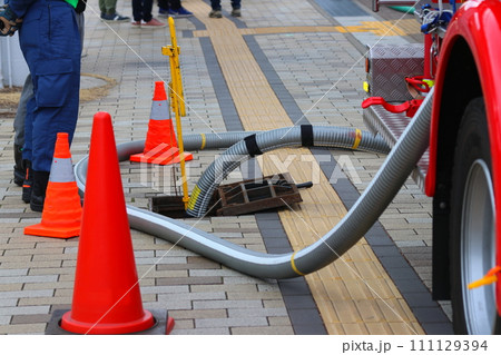 市民参加型のNBCテロ対策訓練:消防車へ給水する、歩道の消火栓