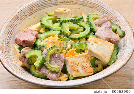 沖縄料理、ゴーヤチャンプル、ゴーヤチャンプルー。夏野菜と木綿どうふ、豚肉と卵の炒め物。