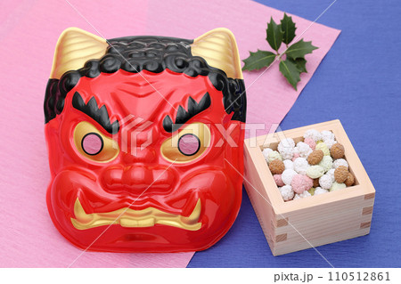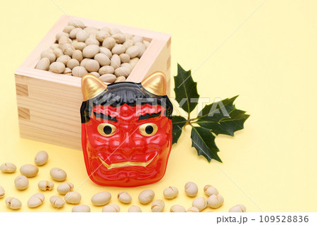 節分イメージ、赤鬼のお面と升に入った豆(白背景)