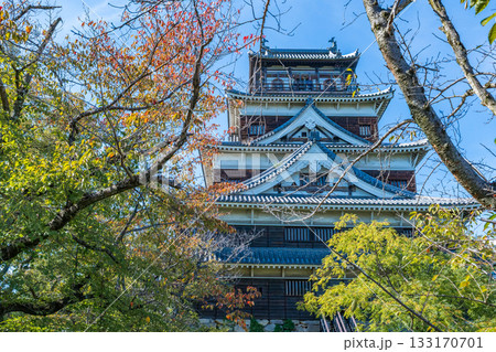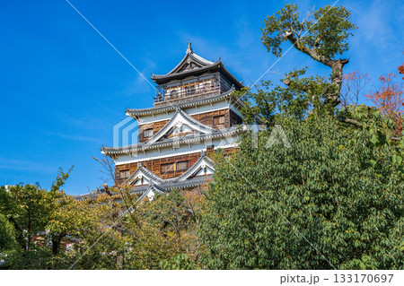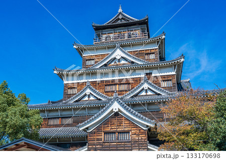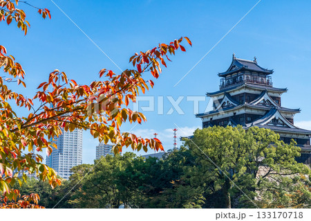 広島市 青空に映える広島城天守閣と紅葉