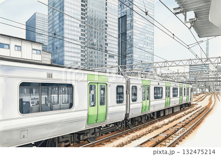 山手線 水彩画 ペン画 イラスト ホームに停車する電車 (E235系)