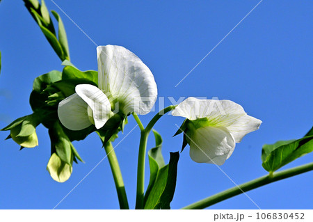 土手の家庭菜園でえんどう豆の白い花が咲いていた