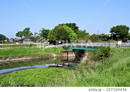 綾瀬川に架かる立合橋とその奥の掛樋史跡公園