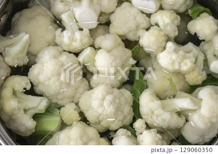 Fresh cauliflower is boiled in a saucepan with water. The vegetable is divided into florets and boiled in a saucepan.