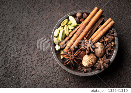 White background against vintage brown paper with some medicinal herbs above including star anise, dried rose buds and dried locust pods. Photo for product of cosmetic or medicine, top view