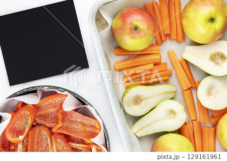 Fresh vegetables and fruits on baking trays with empty black board on white kitchen table. Vegan and vegetarian diet. Cooking and eating at home. Veganuary. Flat lay, closeup, place for text