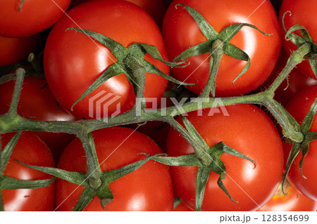Red tomatoes are lying in transparent trays on the shop counter. Tomato theme background