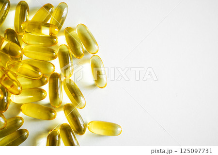 Gel capsules cod liver oil omega-3 on white background. Nutritional supplement.