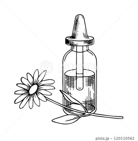 jar with aromatic chamomile oil, cosmetics. vector illustration in sketch style.