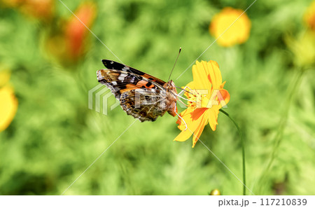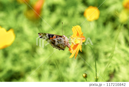 キバナコズモスの花で吸蜜するアカタテハ【タテハチョウ科】