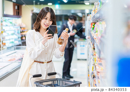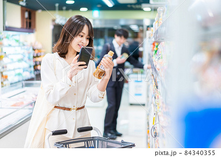 スーパーの商品をスマホで調べる若い女性