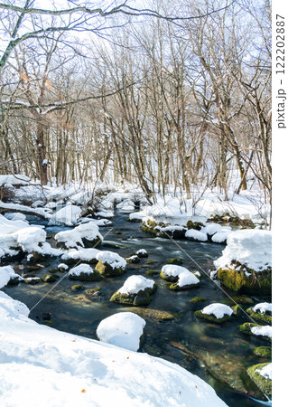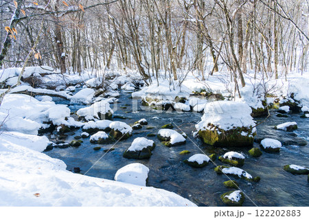 「青森県」雪の積もった奥入瀬渓流 冬の自然美