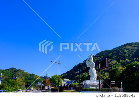 秋晴れ光芒に映える厳木町の名物巨大像「佐用姫像」 道の駅厳木 「風のふるさと館」(佐賀県唐津市)