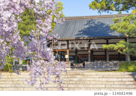 春の桜に彩られた生田神社の楼門。神戸市、兵庫県、日本