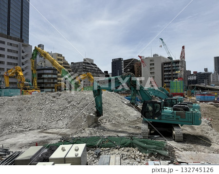 建設工事中のクレーン車でコンクリート資材を吊り上げ 池袋六ツ又交差点 再開発エリア