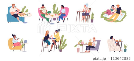 People relax eating. Relaxing leisure cafeteria, couple on chairs eating food in cafe dinner or home, business lunch breakfast coffee break dining meal classy vector illustration