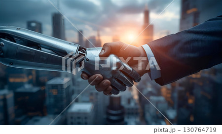 都市を背景にロボットとビジネスマンの握手の3dグラフィック