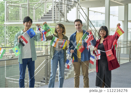 笑顔で並ぶ多国籍の人々と国旗イメージ