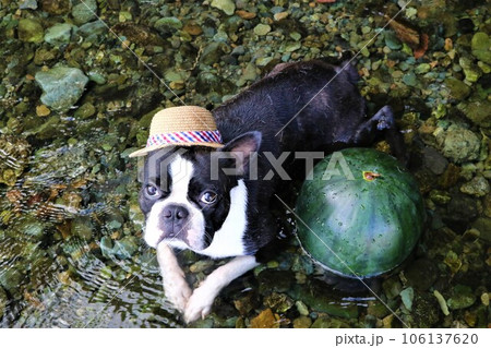 スイカと一緒に都幾川に入って上流を見つめる麦わら帽子のボストンテリア♡マイティ君
