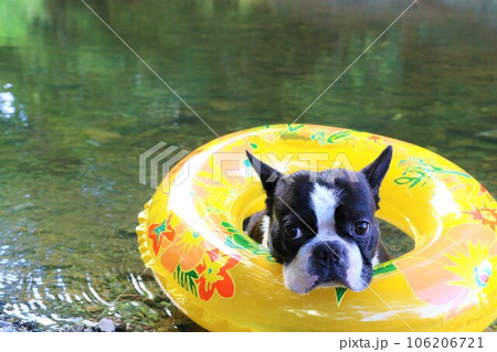 ときがわ町の都幾川で浮き輪に入って可愛く見つめるボストンテリアのマイティ君♡