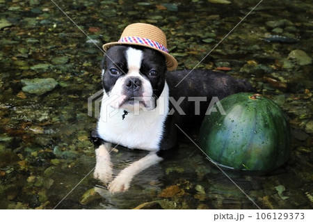 ときがわ町の都幾川にスイカと入ってる麦わら帽子のボストンテリア♡マイティ君