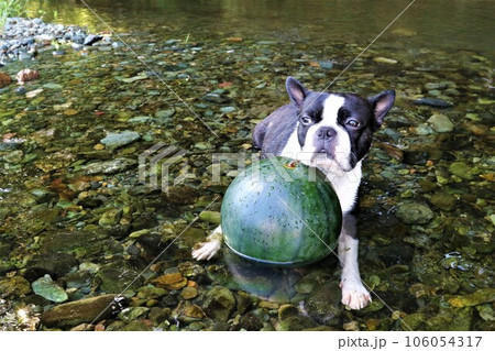 ときがわ町の都幾川の清流に冷やしたスイカを前に上流を見つめるボストンテリアのマイティ君♡