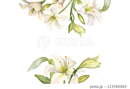 Banner of flowers pastel color botanical art hand drawn. White lilies watercolor isolated on white. Frame with lilium and leaves. Design for wedding invitation in church, christening, Easter card