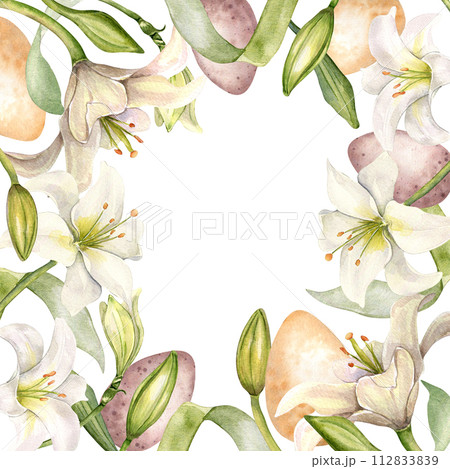 Floral frame with Easter eggs and white flowers. Lily and buds watercolor banner isolated on white. Lilium botanical art hand drawn. Design for invitation, Christianity holiday, Easter decoration
