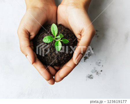 Sustainable agriculture planting with hands nurturing seedling in sunlit garden scene