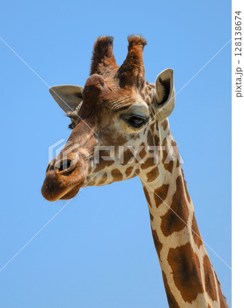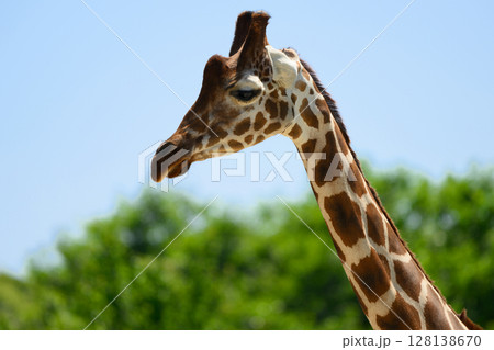 青空を見上げるキリンの頭部