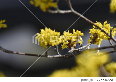 サンシュユ 黄色い小さな花の集まりが春先に咲く クローズアップ