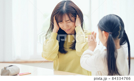 ベンチで泣く親子・生徒・教師の女性(悲しい・トラブル・落ち込む・ショック・絶望・不幸)