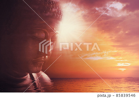 Asian Buddha face sign of peace quiet calm with sunset sea for meditation peaceful background