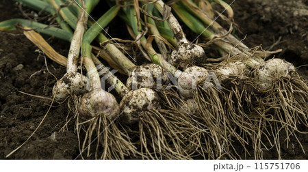 収穫したてのニンニク 畑