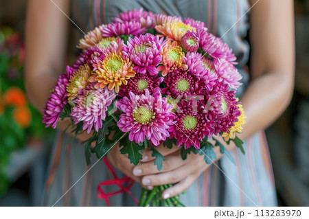 A woman hands gently hold a vibrant bouquet of chrysanthemums