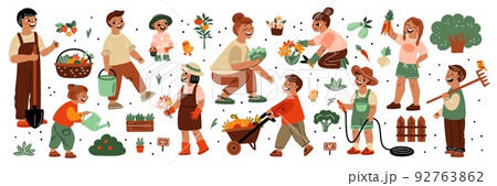 Kids plants. Funny little gardeners with parents. Children take care of flowers. People watering bushes and picking harvest. Ecology and nature. Garish vector gardening persons set