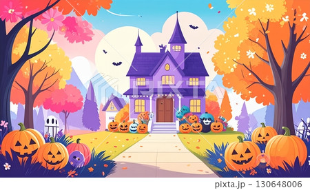 ハロウィンの紫の家とカラフルな秋の木々とかぼちゃ