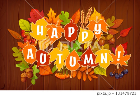 Happy autumn banner with fall season leaves on wooden background decorated with autumn foliage, acorns and berries. Vector greeting card with colorful seasonal leaves forming the phrase happy autumn