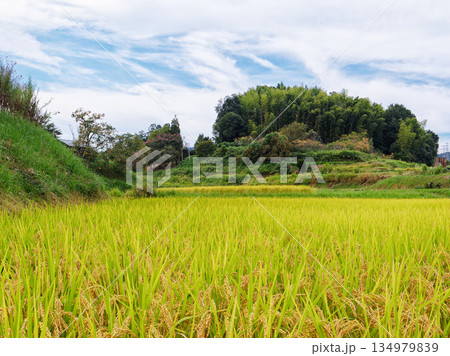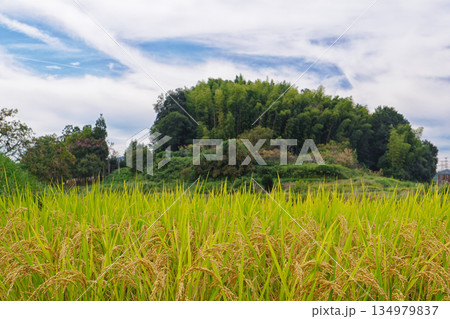 【奈良県生駒市/南田原】収穫間近の稲穂と里山の風景