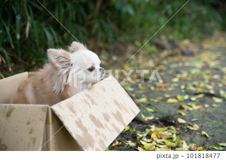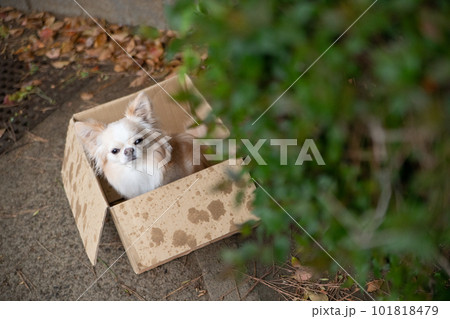 小雨の中、段ボールの中でたたずんでいる小型犬