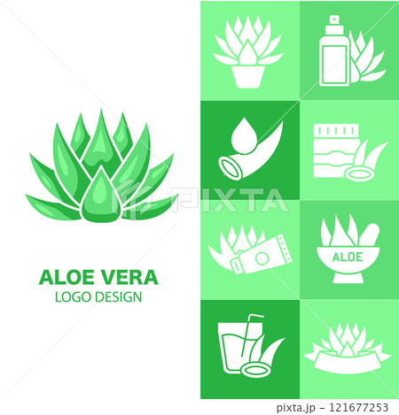 Aloe Vera Logo andGreen Brand Design Set. Cosmetic Icons and Plant Prints in a vector illustration