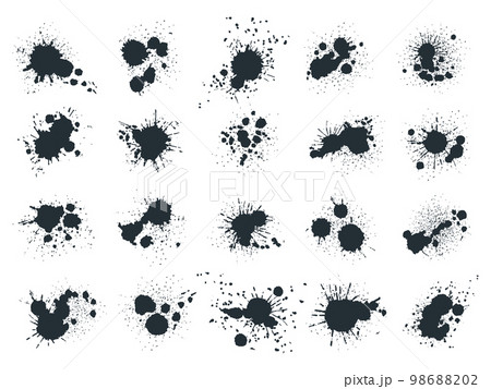 Ink blob splashes. Black paint drops and spots, abstract ink splatters. Liquid writing ink grunge drops silhouettes flat vector illustration set