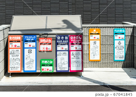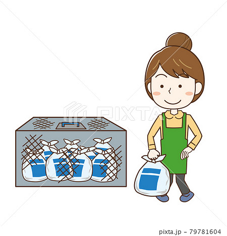 分別したゴミ袋を持ってゴミ捨てに行く女性のイラスト・ゴミ置き場・ゴミステーション