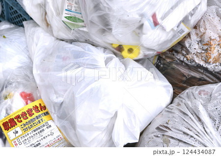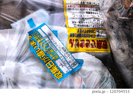 日本の横浜都市景観 残されたゴミ袋…「収集日が違います」や「収集できません」のシール=横浜市内