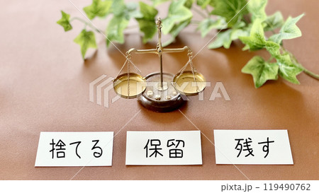 天秤と3枚のカードに捨てる保留残すの文字_茶色背景