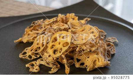 トレーに盛られた備蓄できる乾燥野菜(れんこん)俯瞰