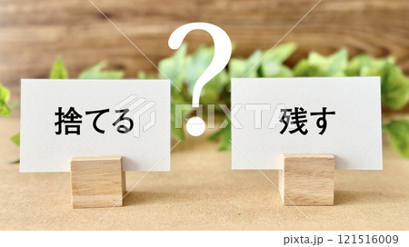 捨てると残すのカードとクエスチョンマークとツタ_茶色板背景
