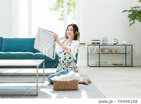 リビングのソファーで洗濯物を畳むエプロンをしたミドル〜シニア女性