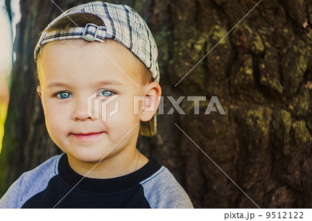 Happy child wearing striped cap in outdoor portrait