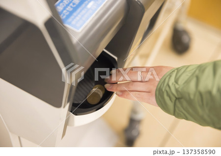 スーパーのレジの釣銭口からおつりを取り出す女性手元